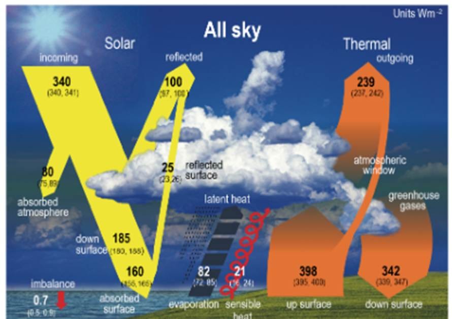 At the top of the atmosphere (TOA) one can measure an average of over 24 hours of solar radiation hitting the Earth (340 W/m2, +1/—0) and thermal radiation emitted (239, +3/—2) and which together provide balance and relatively stable global temperature. The IPCC believes that the imbalance that causes warming is 0.7 W/m2, but this imbalance is less than the uncertainty and could therefore just as easily be 0 (zero). Not certainly measurable.