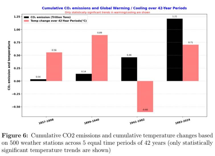 Bhatta conducted a study10 of over 60 million daily temperature observations from over 1600 global weather stations, with continuous records spanning from the pre-1900 era to 2024. Bhatta showed that temperature rose more before 1940 when CO₂ emission was relatively low compared to present when CO₂ emission is relatively high, as seen in the figure below. There is no indication that rises in CO₂ causes rise in T.