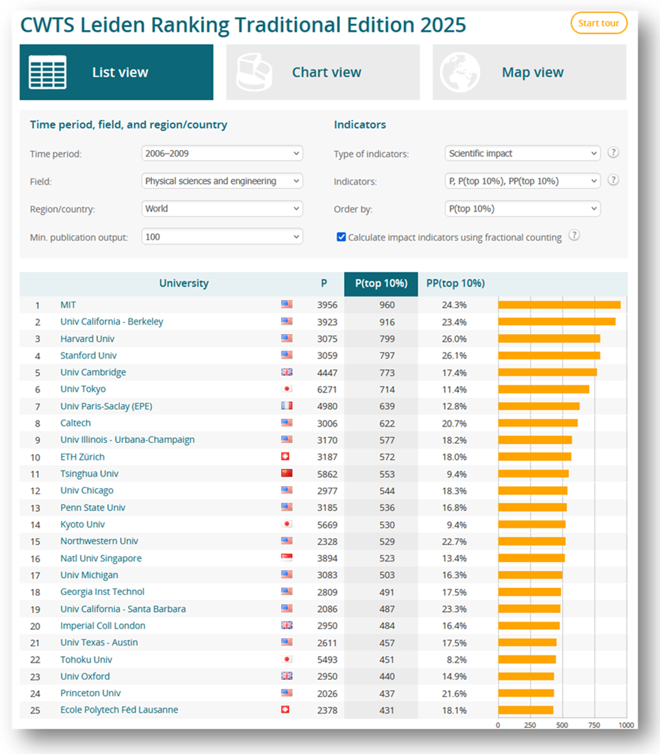 To get a more objective picture, free of performances in such “sciences”, I propose to limit the ranking to “Physical sciences and engineering.” Then we see that 25 universities out of the top-25 in the ranking are Chinese.